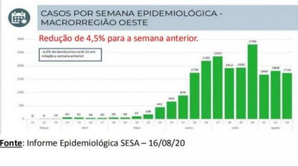 A Secretaria de Saúde de Cascavel trouxe no Boletim Informativo da Covid-19 dados compartilhados pelo Governo do Estado sobre a situação epidemiológica da Covid-19, na região Oeste. De acordo com o documento, a macrorregião apresentou uma queda de 4,5% no número de novos infectados, na comparação com as duas úlitmas semanas.