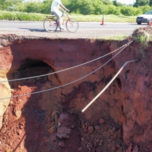A cratera que se abriu na rodovia PR-323, em Umuarama, no dia 23 de dezembro durante uma tempestade que afetou toda a região, voltou a crescer na noite desta terça-feira (9) com a nova tempestade que atingiu o município. Desta vez uma erosão surgiu também no acostamento do lado direito da pista.