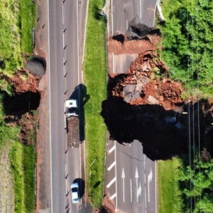 A redação de OBemdito esteve no local na manhã desta quarta-feira (10) e capturou imagens aéreas que revelam a extensão do problema e evidenciam o alcance da erosão que agora atingiu completamente o lado esquerdo da pista, afetando parte do canteiro central. O lado direito também está passando por erosão, gerando preocupação entre os usuários da rodovia que transitam pela área.