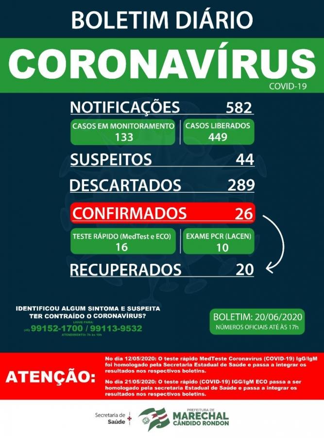Três novos casos de Covid-19 foram confirmados neste sábado (20), pelo departamento de Vigilância Epidemiológica de Marechal Cândido Rondon que divulgou novo boletim onde consta a confirmação de um total de 26 casos de coronavírus no município. 44 pessoas estão com a suspeita da doença e aguardam resultado de exame.