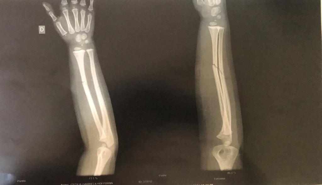 O resultado do exame (imagem acima) apresentou duas fraturas fechadas no braço da criança, que voltou para o hospital Bom Pastor após fazer o Raio-X, e ficou aguardando em um leito a transferência para algum hospital da região a fim de receber atendimento especializado.