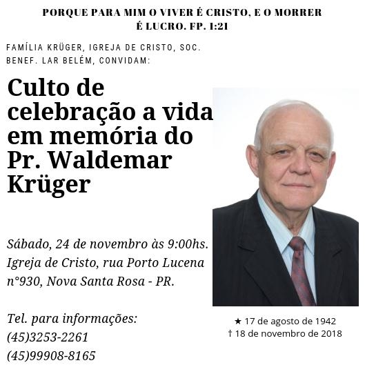 A família Krüger, Igreja de Cristo e Sociedade Lar Belém convidam a comunidade para o culto de celebração a vida em memória do Pastor Waldemar Krüger no sábado (24) as 09h00 na Igreja de Cristo localizada na rua Porto Lucena nº 930 em Nova Santa Rosa.