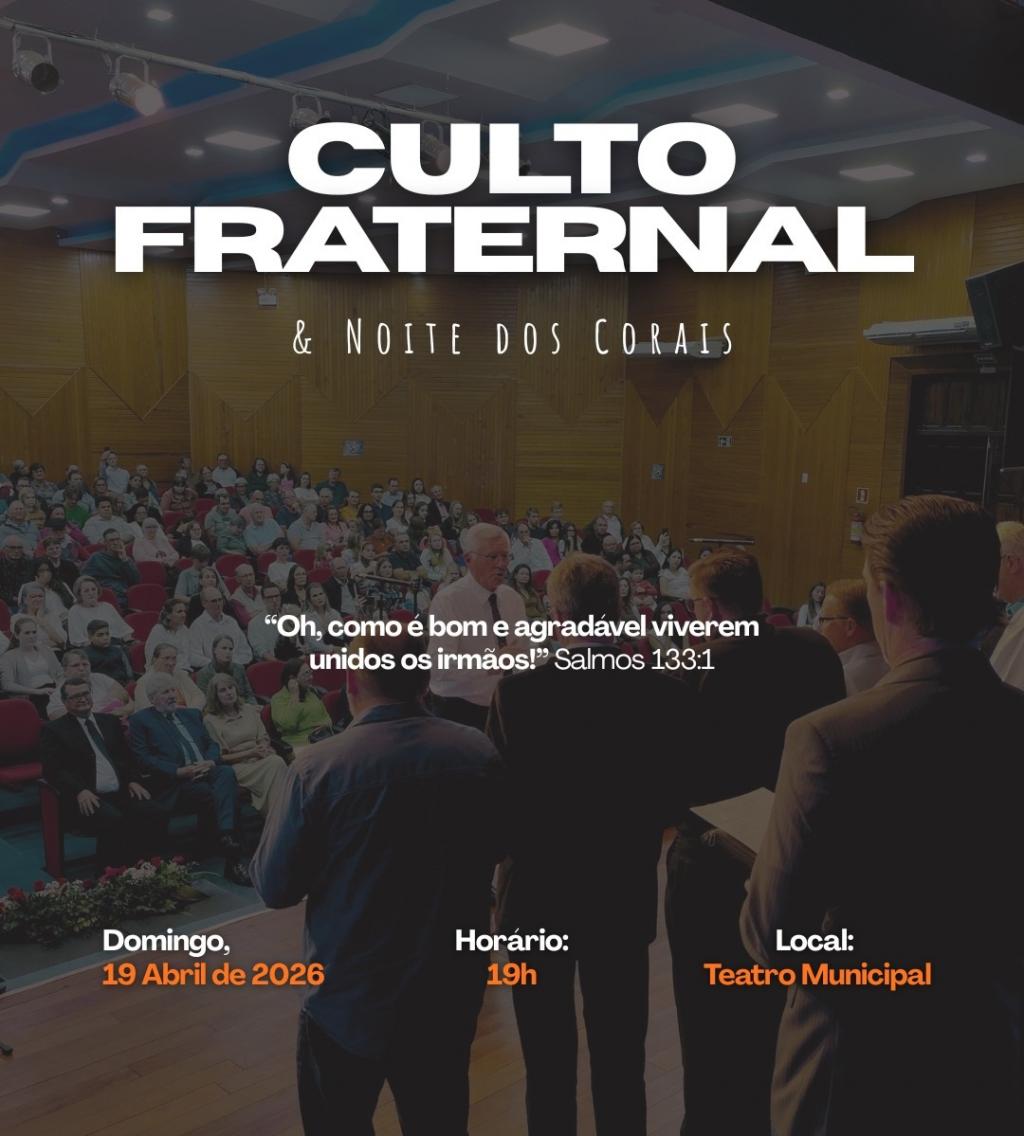 No domingo, dia 19 de abril, será realizado o Culto Fraternal e Noite dos Corais, com início às 19h, no Teatro Municipal Gustavo Fischer. O evento é aberto ao público.