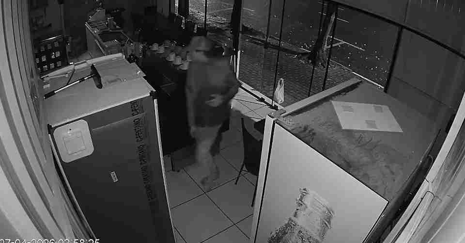 As câmeras de segurança do estabelecimento registraram a ação criminosa por volta das 3h40. As imagens mostram um homem magro, alto, de pele parda, vestindo moletom preto e boné, que após cometer o furto fugiu do local.