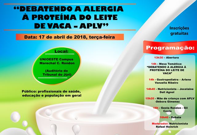 Às 13h30 acontecerá a abertura. Na sequência, às 14h, começará a mesa temática “Debatendo a Alergia à Proteína do Leite de Vaca”, com a gastropediatra Arlene Vanzella Ribeiro; às 14h40, com a nutricionista Jocelaine Dall’Agnol; às 15h20, com Débora Gimenez, que tem um filho com APLV; às 16h, com a doula Gil Costa, do Gesta Rondon e às 16h40 serão abertos os debates.