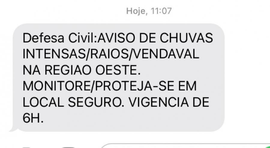 A Defesa Civil do Paraná alerta para o risco de temporal no Oeste do Paraná. O comunicado foi divulgado nesta terça-feira (29), e tem vigência de 6h. Há possibilidade de ventos fortes, chuvas intensas, raios e até granizo.