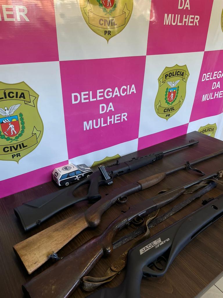 A equipe policial da Delegacia da Mulher de Toledo cumpriu ordens judiciais e realizou ações educativas durante todo o dia de hoje. Logo no início deste dia, ao dar cumprimento a um Mandado de Busca e Apreensão, foram localizadas 03 armas de fogo e 01 carabina de pressão, que estavam sendo utilizadas em ameaças contra uma vítima de violência doméstica.