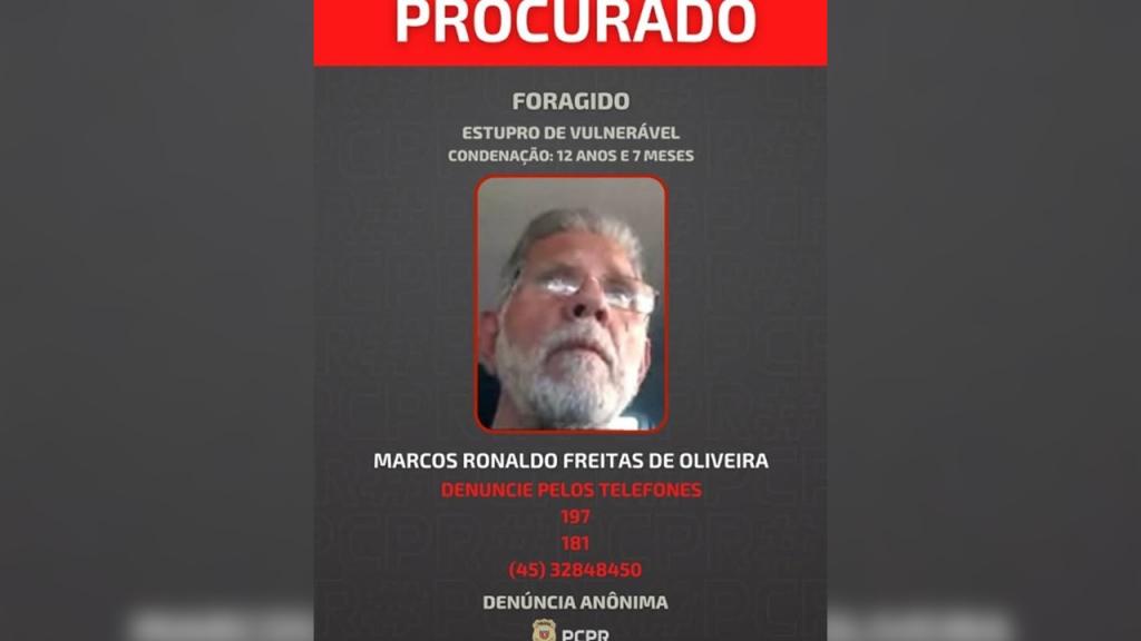 A Delegacia de Marechal Cândido Rondon informa que Marcos Ronaldo Freitas de Oliveira é considerado foragido da Justiça. Ele foi denunciado e condenado pela prática de crimes graves, conforme o art. 217-A do Código Penal, em três ocasiões distintas, envolvendo uma vítima menor de idade.
