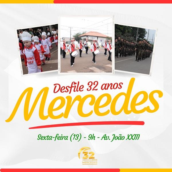 Em comemoração ao 32º aniversário de Mercedes, o tradicional desfile cívico será realizado nesta sexta-feira (13), às 9h, na Avenida João XXIII. O evento será realizado às 9h, na Avenida João XXIII, com o palco montado na quadra da praça central.