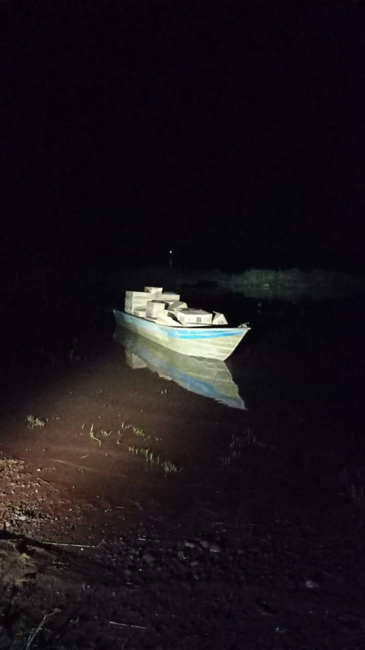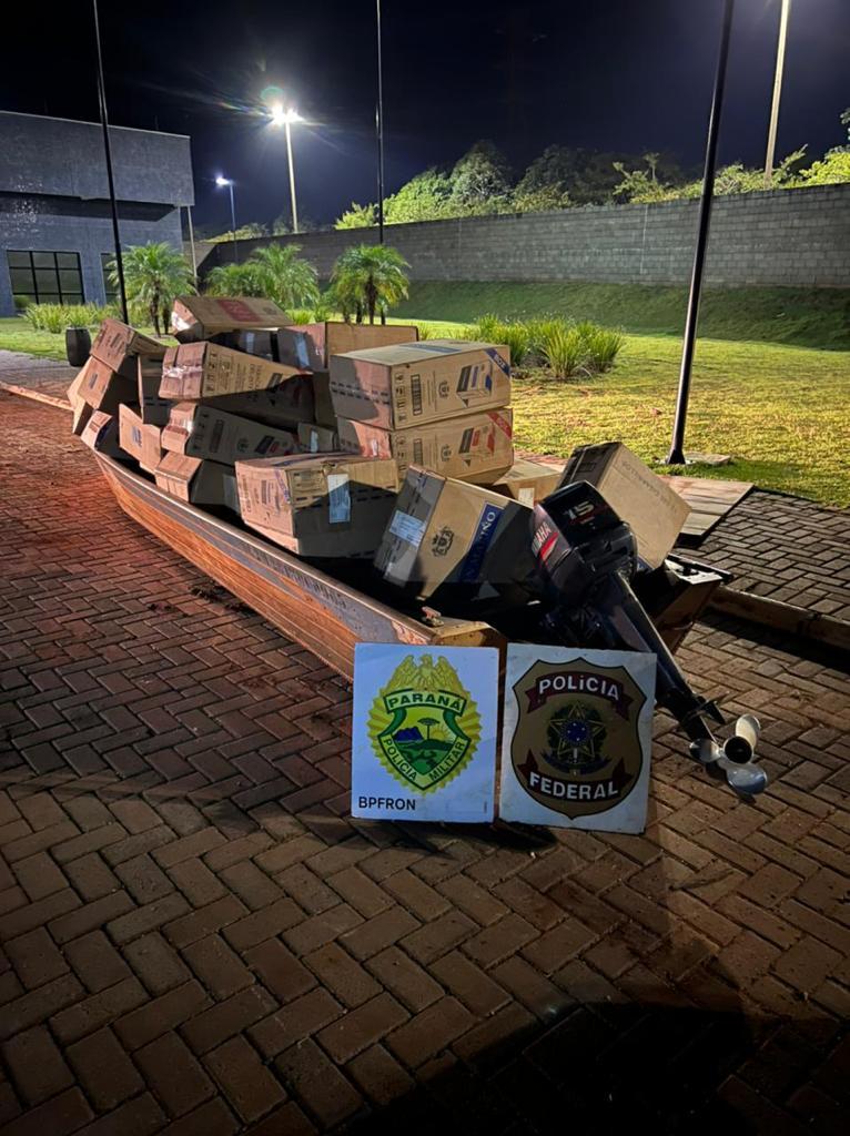 Os policiais perceberam movimentação suspeita no porto e no momento em que a abordagem foi realizada diversos suspeitos fugiram em região de mata. No local, foram encontradas 50 caixas de cigarros contrabandeados e o barco de alumínio, de aproximadamente 6 metros.