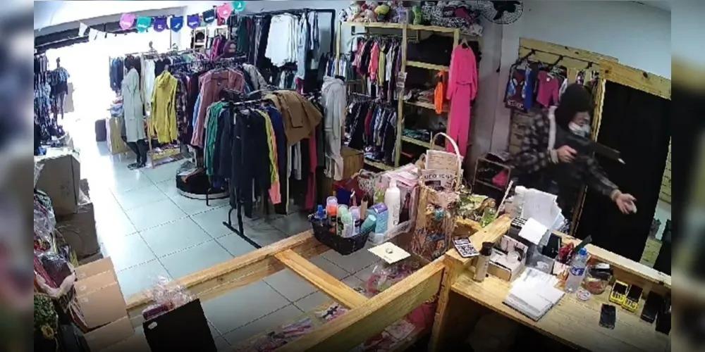 O criminoso anuncia o assalto com uma arma na mão, apontada em direção a vítima. A mulher toma um susto com a presença do bandido. "Jesus, misericórdia", fala a vítima.