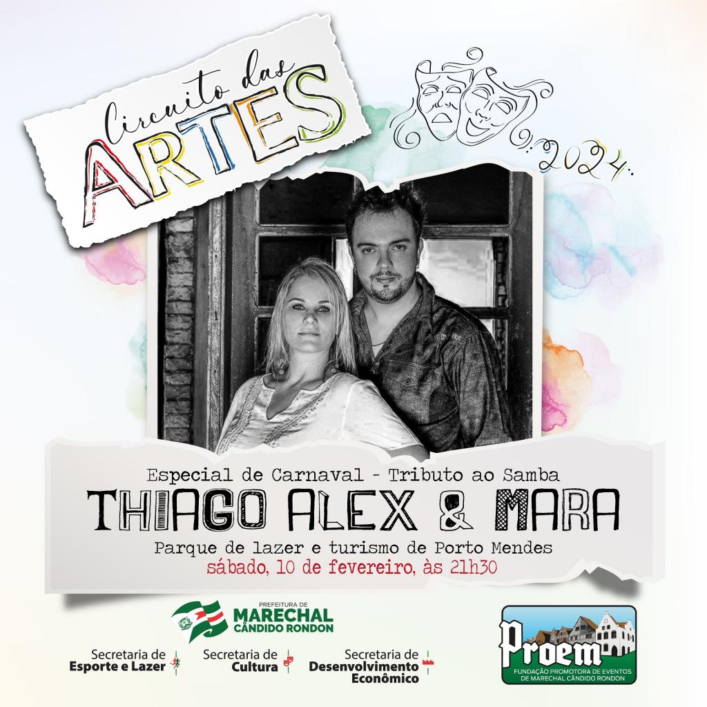 No dia 10 de fevereiro (sábado), haverá aula de zumba das 18h às 19h, seguida de apresentação da dupla Thiago Alex e Mara, das 21h30 à 1h30, no parque de lazer e turismo de Porto Mendes.