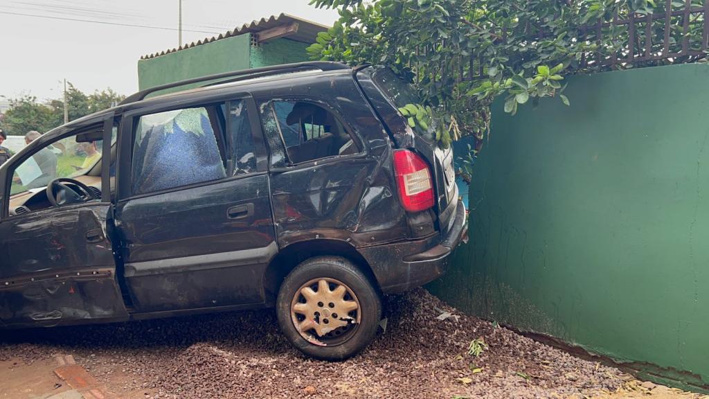 O impacto da batida fez o carro rodar e derrubar o muro de uma residência.