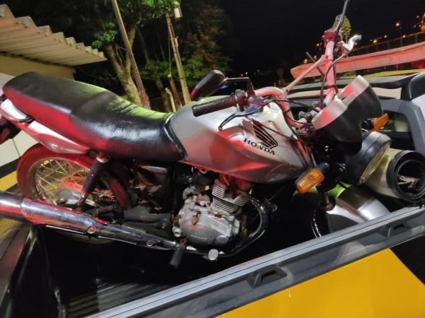 Foi dado ordem de parada e após abordagem e identificação do veículo e do condutor e passageiro da motocicleta foi constatado que a mesma possuía registro de furto no Município de Assis Chateaubriand na quinta-feira (09).