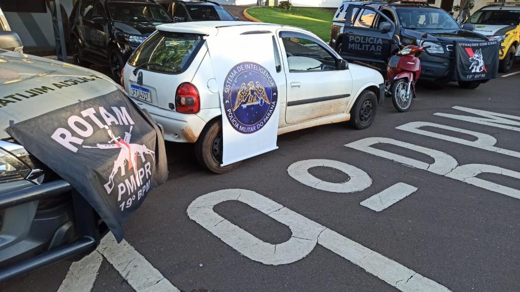 A equipe da Rotam da Polícia Militar (PM) foi até o endereço e localizou o automóvel GM/Corsa de cor branca. Em consulta ao sistema, foi verificado que o carro estava com a placa adulterada.