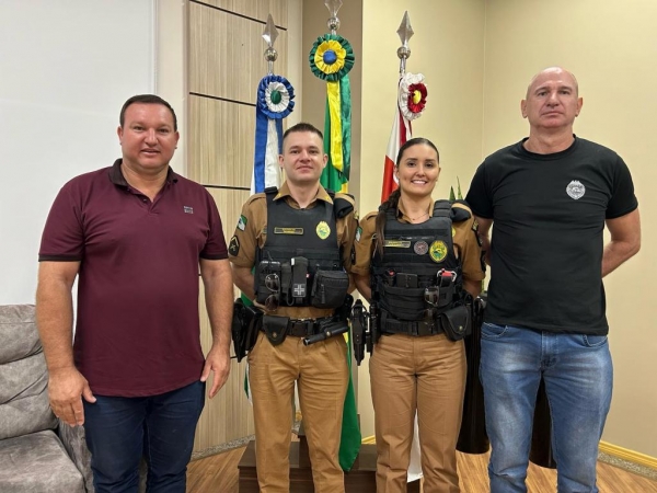 O prefeito Laerton Weber recebeu nesta quarta-feira (27) a Soldada Cassiana e o Soldado Tavares, os dois novos membros do Destacamento da Polícia Militar de Mercedes. O Sargento Jurandir acompanhou a apresentação.