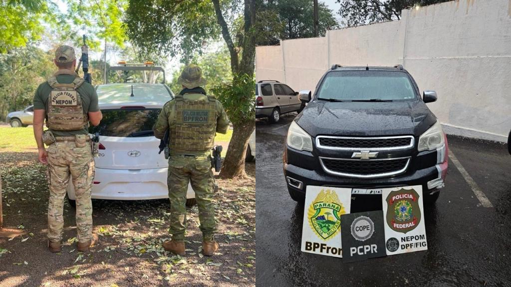 Dois veículos furtados no Estado de São Paulo foram recuperados por forças de segurança na região Oeste do Paraná, durante ações conjuntas do Batalhão de Polícia de Fronteira (BPFron), Polícia Federal/NEPOM e Polícia Civil/COPE. As operações integram a Operação Protetor de Divisas e Fronteiras.