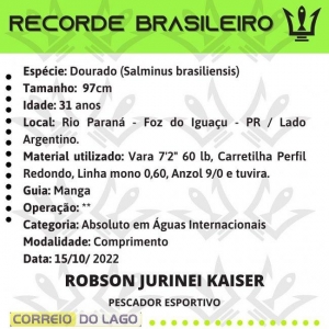 O dourado que mediu 97cm e pesou aproximadamente 20kg, entrou para o hall da fama da BGFA, na modalidade comprimento. O recorde anterior era de 86cm e o exemplar foi capturado pelo Jocimar Matheus, também no Lago de Itaipu.
