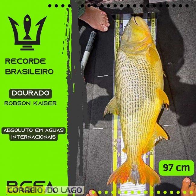 Capturado durante uma pescaria em águas internacionais no Rio Paraná, o Dourado que mediu 97cm de comprimento, foi certificado pela BGFA Records, a entidade oficial certificadora dos recordes de peixes no Brasil.