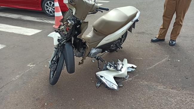 Um acidente entre um automóvel e uma moto foi registrado na tarde deste sábado na Rua Santos Dumont esquina com Rua general Alcides Etchegoy, área central de Toledo.