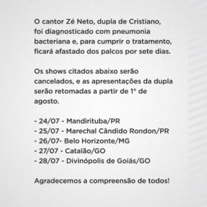 O cantor Zé Neto, dupla de Cristiano, foi diagnosticado com pneumonia bacteriana e, para cumprir o tratamento, ficará afastado dos palcos por sete dias.