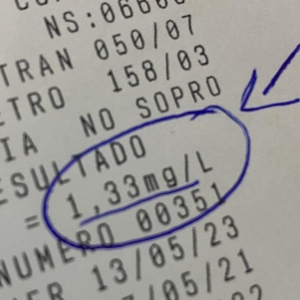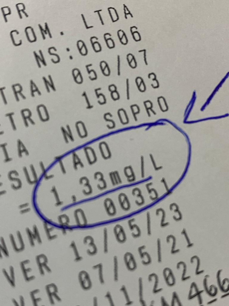 Foi solicitado que o mesmo realizasse o teste etilométrico, no qual resultou em 1,33mg/L.