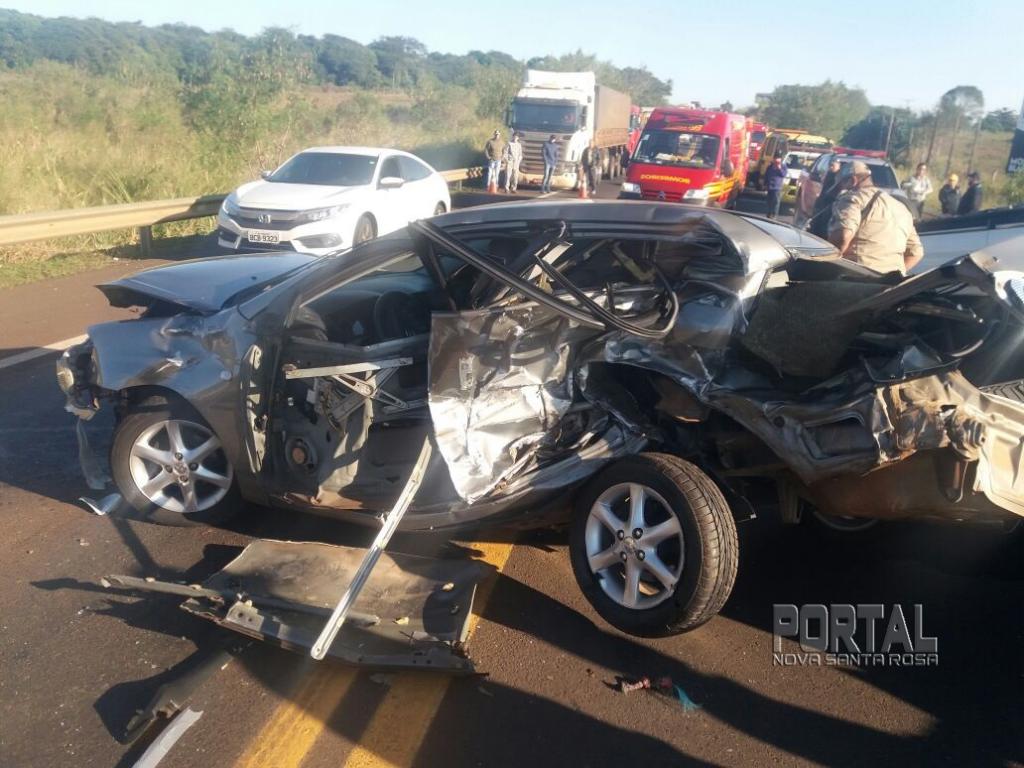 Já no Corolla, que ficou praticamente destruído com o impacto, o condutor ficou gravemente ferido, assim como seu filho de 09 anos que também sofreu fraturas e ficou preso entre as ferragens. Uma mulher que estava no banco do carona não se feriu.