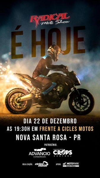 O Radical Moto Show é uma realização da Cicles Motos, com o patrocínio das empresas Advancio Consórcios e Crops Control, e o apoio da Moto Park Keafer Motos — reforçando o compromisso das marcas em promover momentos de lazer e entretenimento para a comunidade local.