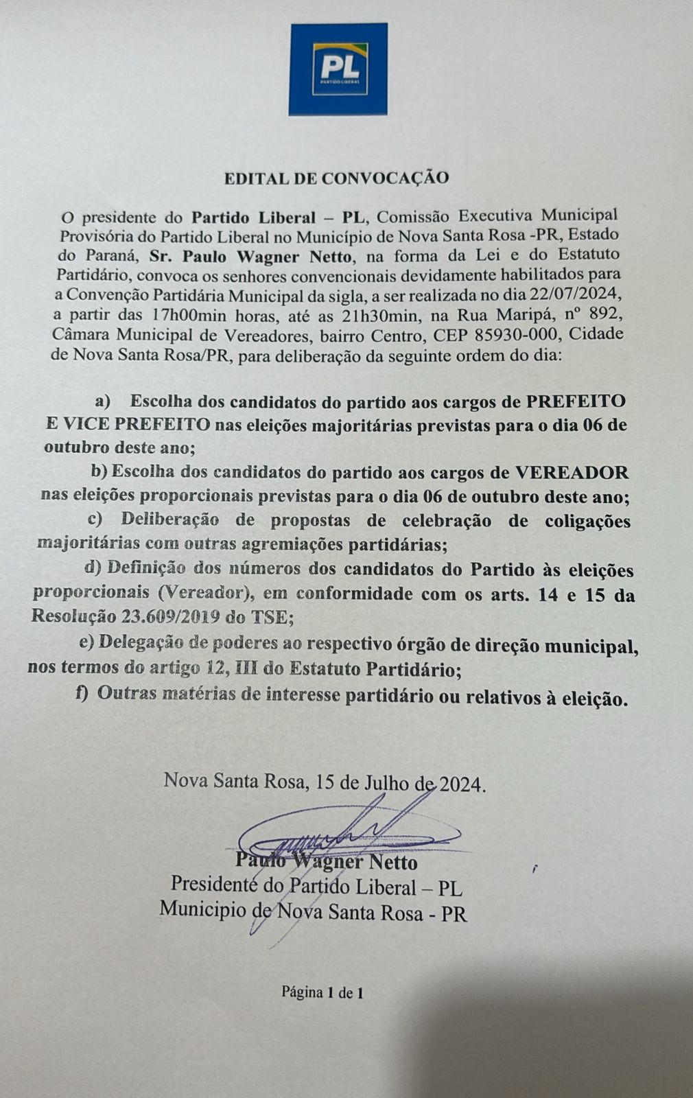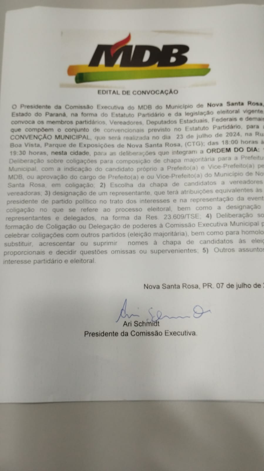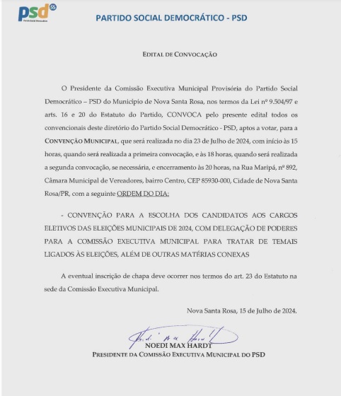Edital de convocação para Convenção Municipal do MDB, PL e PSD em Nova Santa Rosa