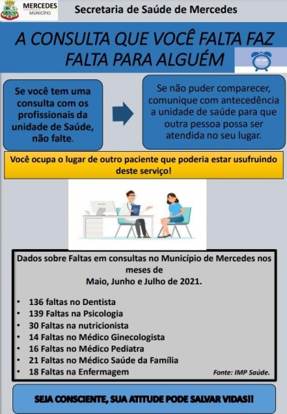 Levantamento realizado pela Secretaria de Saúde de Mercedes aponta que nos meses de maio, junho e julho deste ano, 374 pessoas faltaram nas consultas que foram previamente agendadas.
