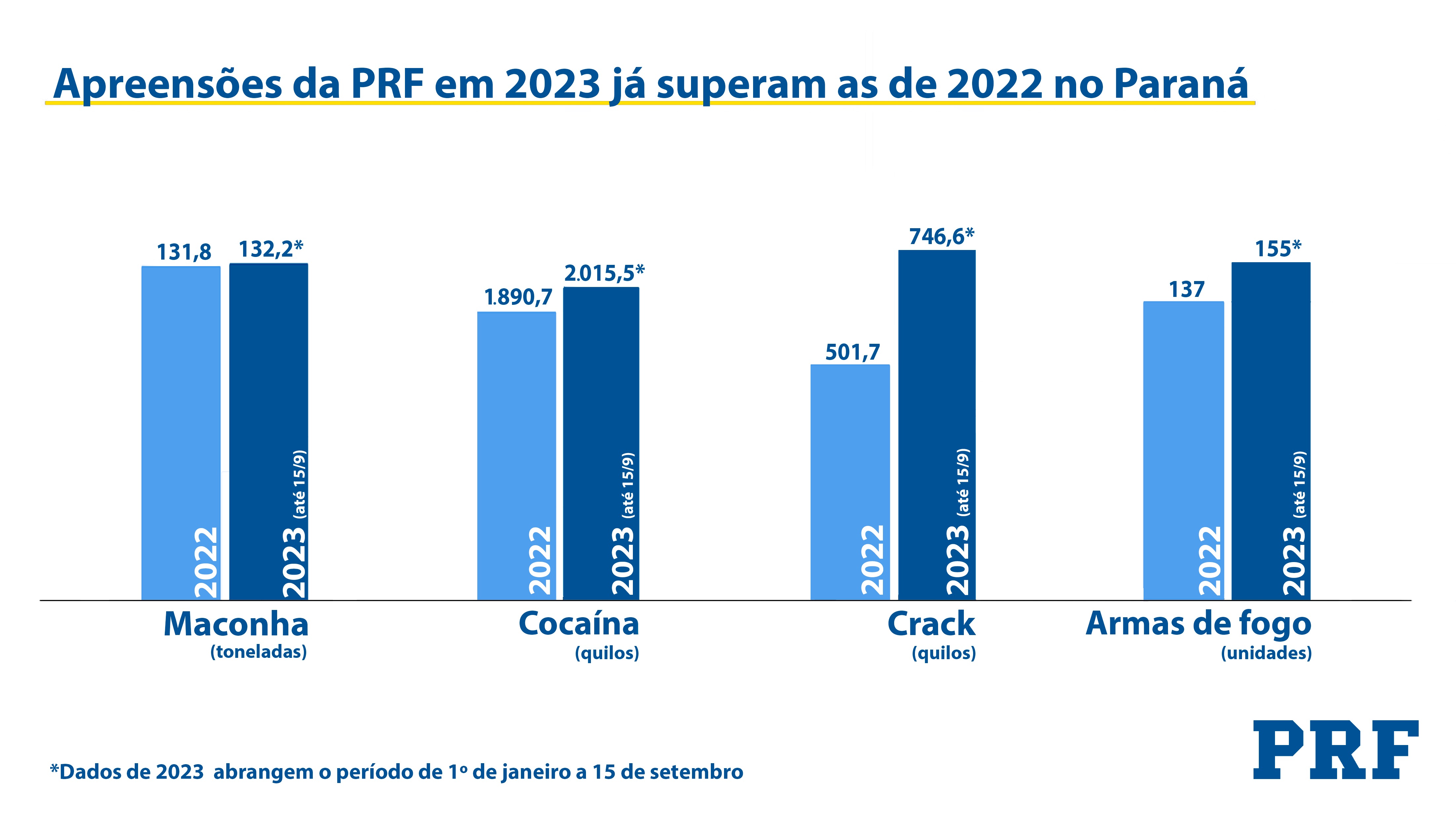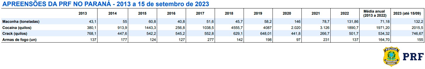 "Faltando mais de três meses para o ano acabar, a PRF já apreendeu mais drogas e armas do que em todo ano de 2022 no Paraná. Esse grande resultado demonstra que, ao mesmo tempo em que priorizamos também a segurança viária, não deixamos em segundo plano o combate ao crime", explica o superintendente da PRF no estado, Fernando César Oliveira.