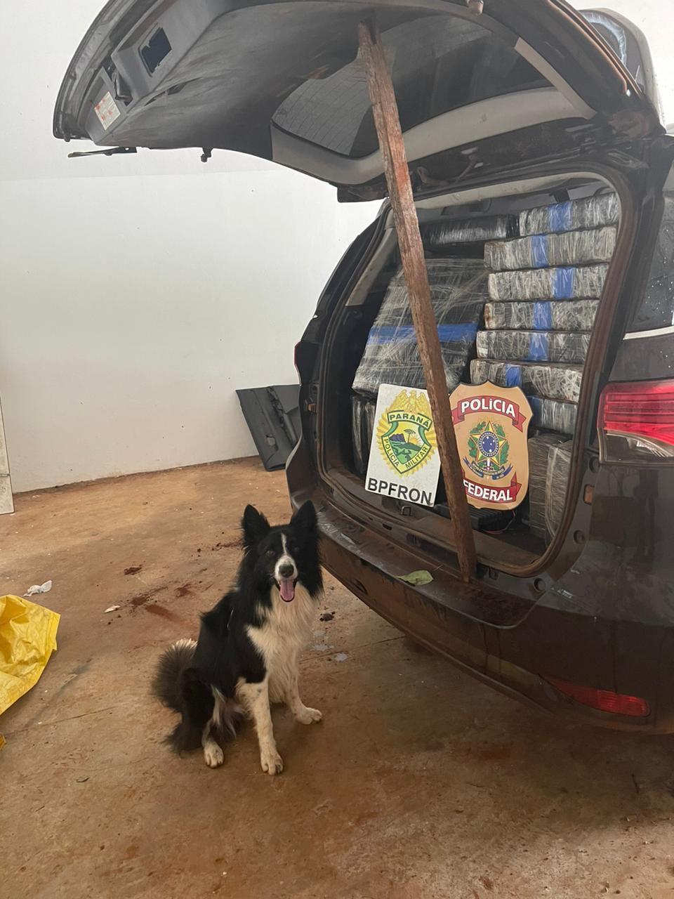 No local informado na denúncia, o cão de faro do BPFron indicou a presença de ilícitos. Dentro do barracão foram localizados dois veículos carregados com um total de 2.269 kg de substância análoga a maconha.
