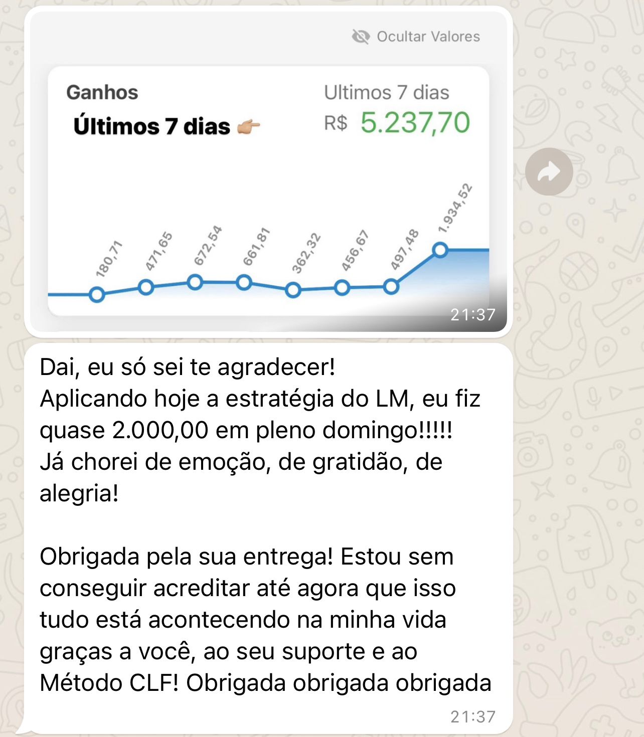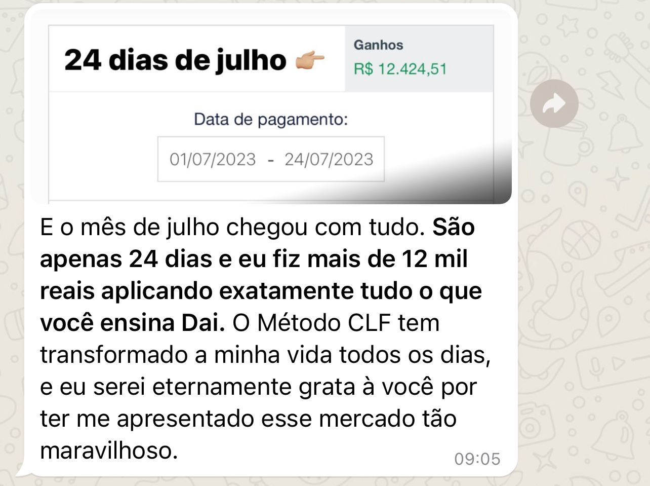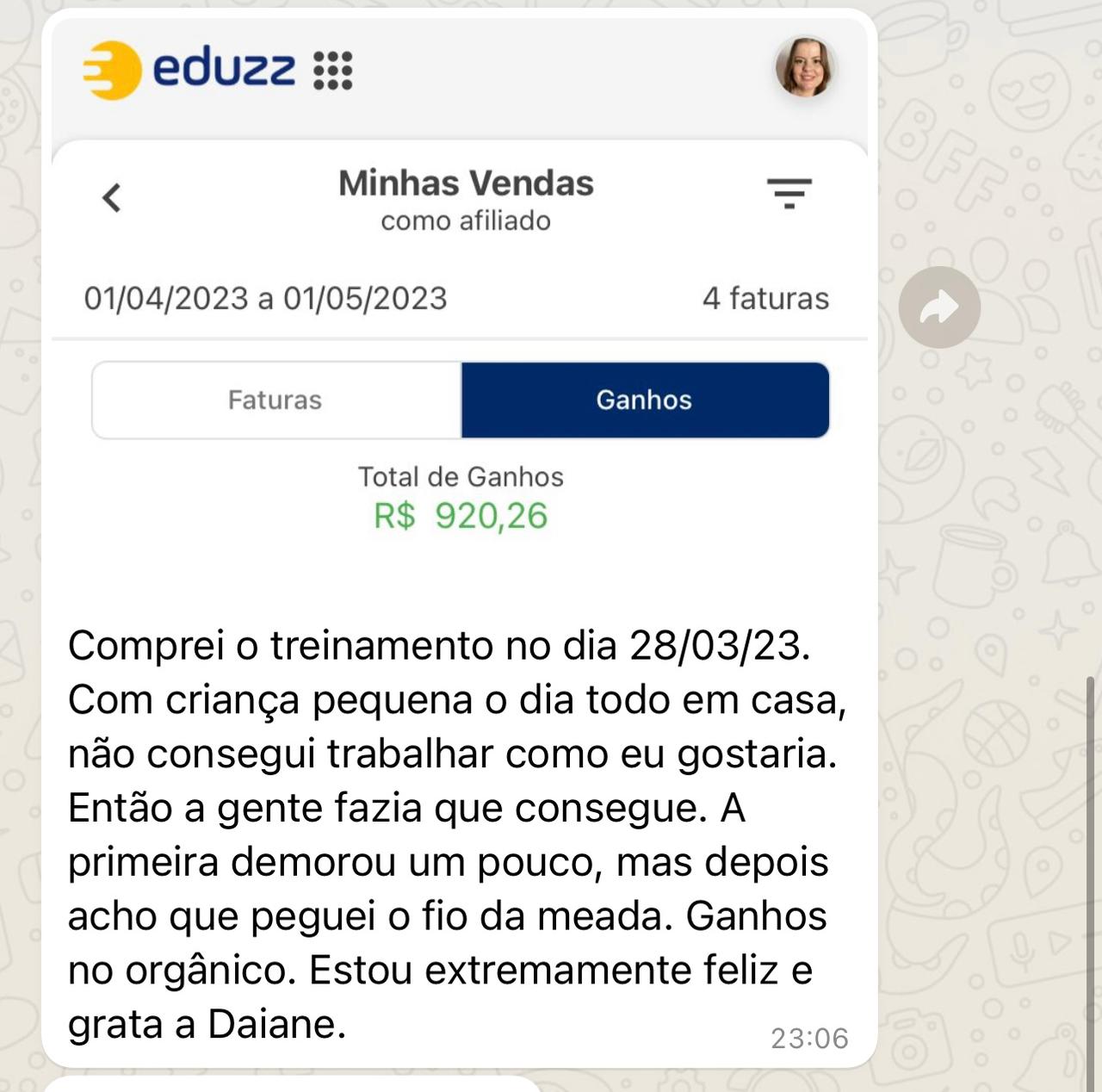 “Em pouco mais de 1 ano, as minhas comissões com vendas de produtos online ultrapassaram 200 mil reais e eu consegui transformar totalmente a minha vida usando ferramentas que eu já tenho: o meu celular e a Internet. Hoje eu tenho a vida dos meus sonhos, com liberdade de tempo e liberdade financeira, e isso tudo aconteceu porque eu tomei uma única decisão, de sair da minha zona de conforto e fazer acontecer”, complementa.