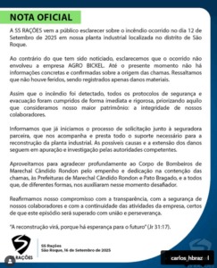 A empresa SS Rações divulgou nesta terça-feira (16) uma nota oficial a respeito do incêndio registrado no último dia 12 de setembro em sua planta industrial, localizada no distrito de São Roque, em Marechal Cândido Rondon.
