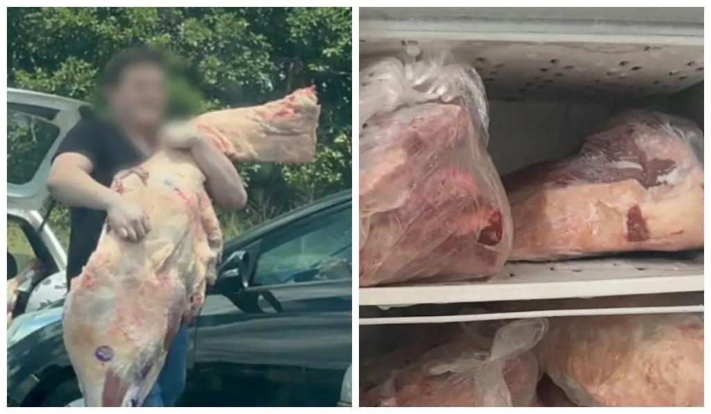 Imagens mostram pessoas "abraçadas" em grandes pedaços de carne. O motorista do caminhão não ficou ferido.