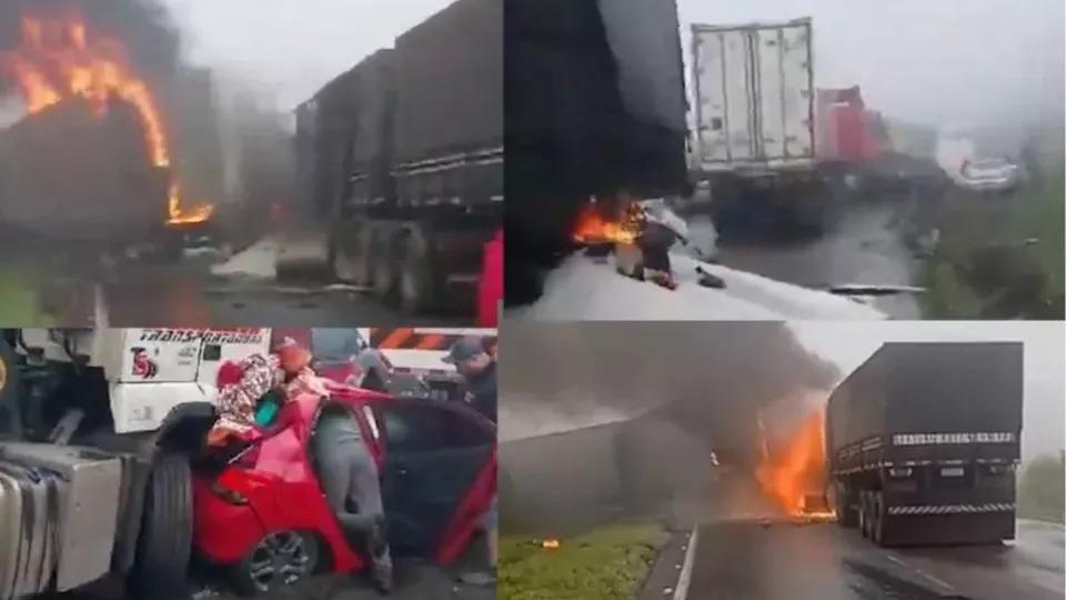 "Tornando essas combinações de veículos em um único veículo, temos o número total de 82 veículos envolvidos diretamente no engavetamento", disse a corporação.