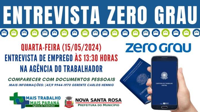 A Prefeitura de Nova Santa Rosa, através da Agência do Trabalhador, informa que hoje (15) a partir das 13h30m acontecem entrevistas de emprego para interessados em trabalhar na Zero Grau.