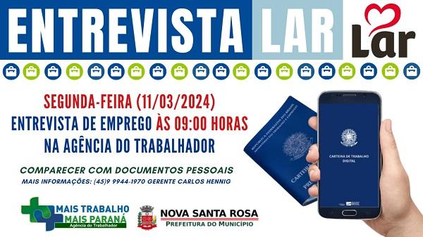 As entrevistas são por ordem de chegada, na Agência do Trabalhador que fica localizada na Rodoviária de Nova Santa Rosa, endereço Rua Ubiretama, 460. É necessário levar os documentos pessoais: RG, CPF e Carteira de Trabalho.