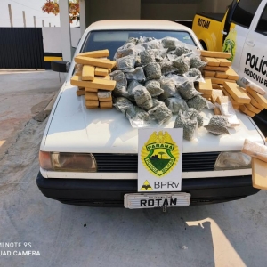 Após na revista minuciosa foram localizados 54.100 kg de maconha e 23.250 kg de super maconha conhecida como " Skank", totalizando 77.350 kg do entorpecente.