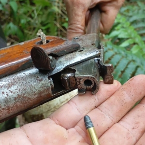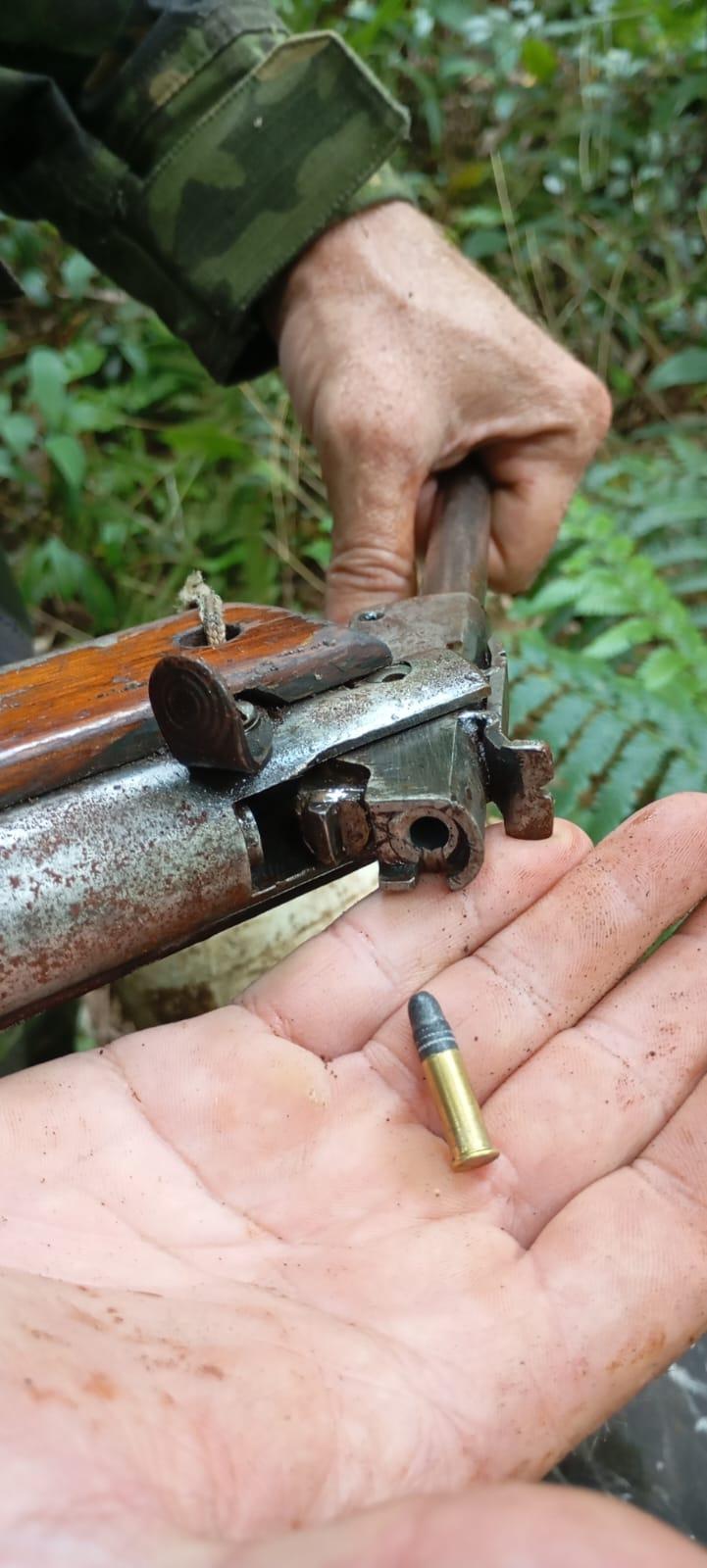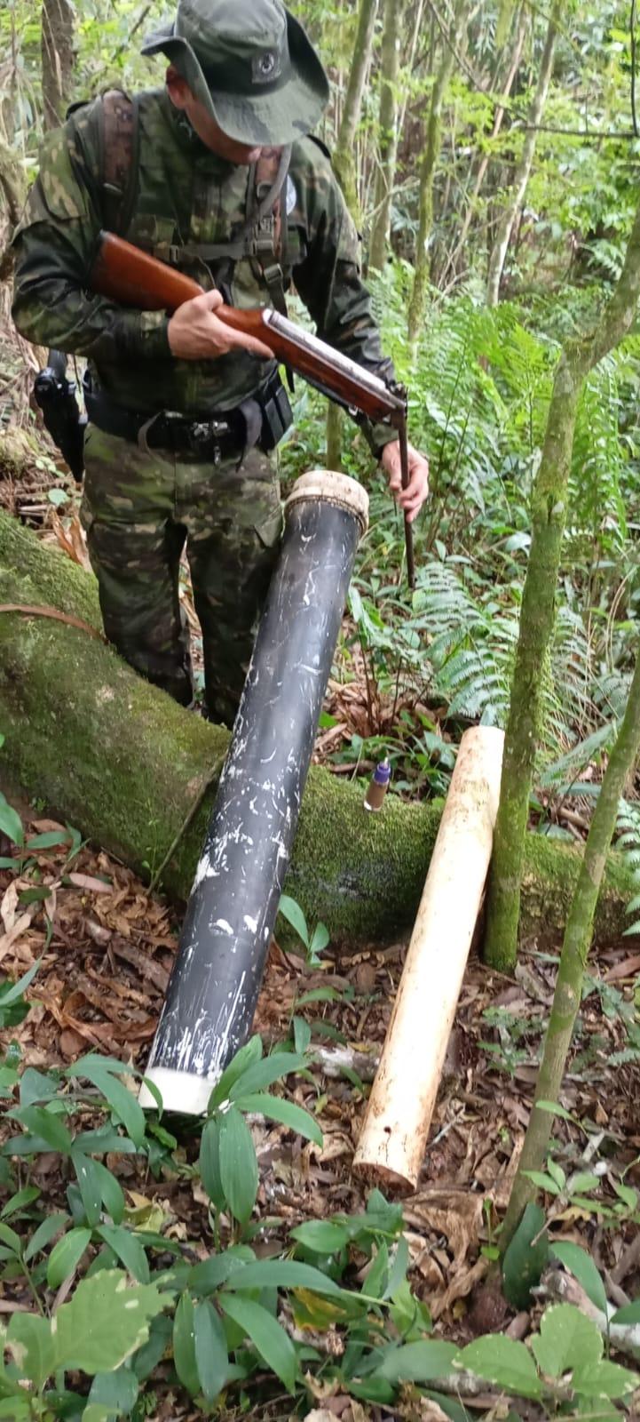Na sequência das buscas foi localizada escondida em uma árvore uma espingarda de pressão preparada para cal. 22 e carregada com um cartucho.