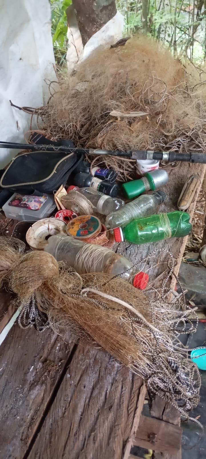 Foram encontrados vários matérias de pesca no acampamento e foram destruídos juntos com acampamento.