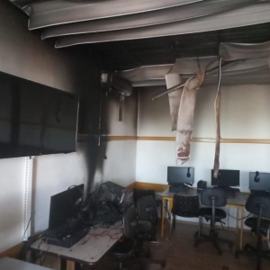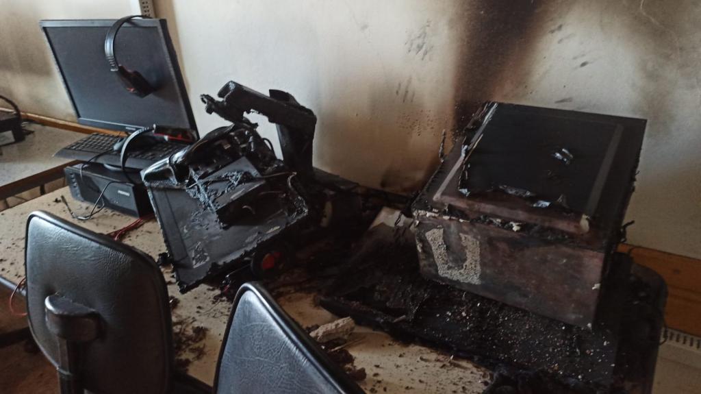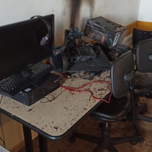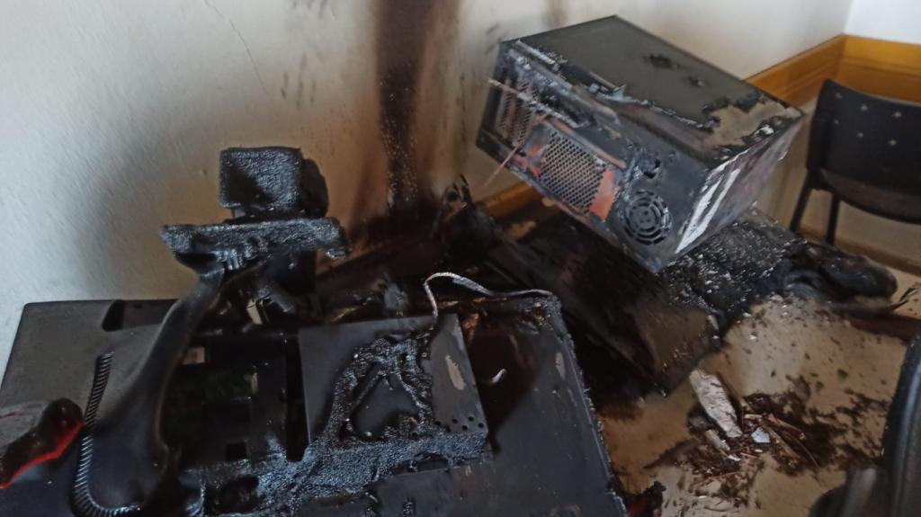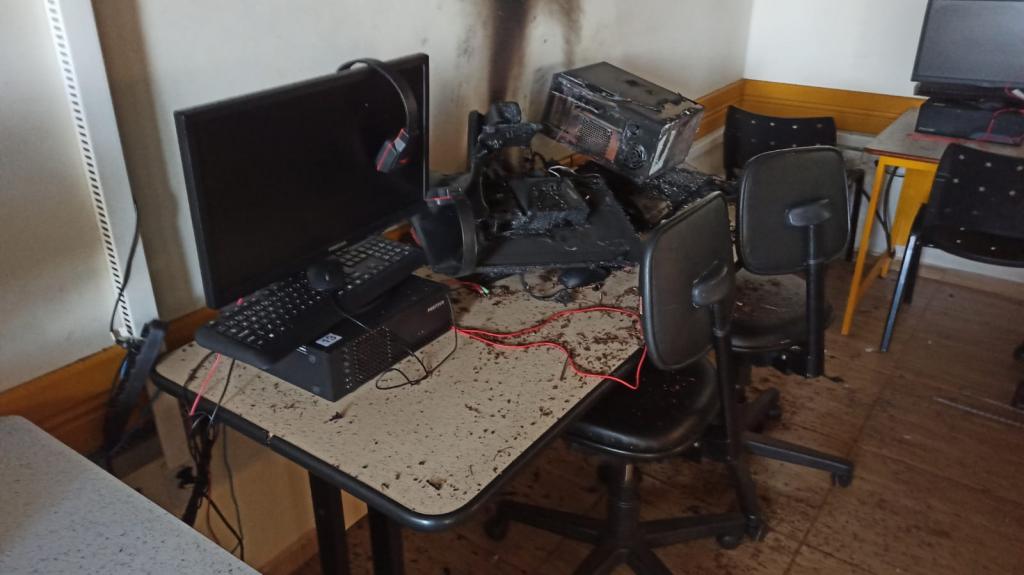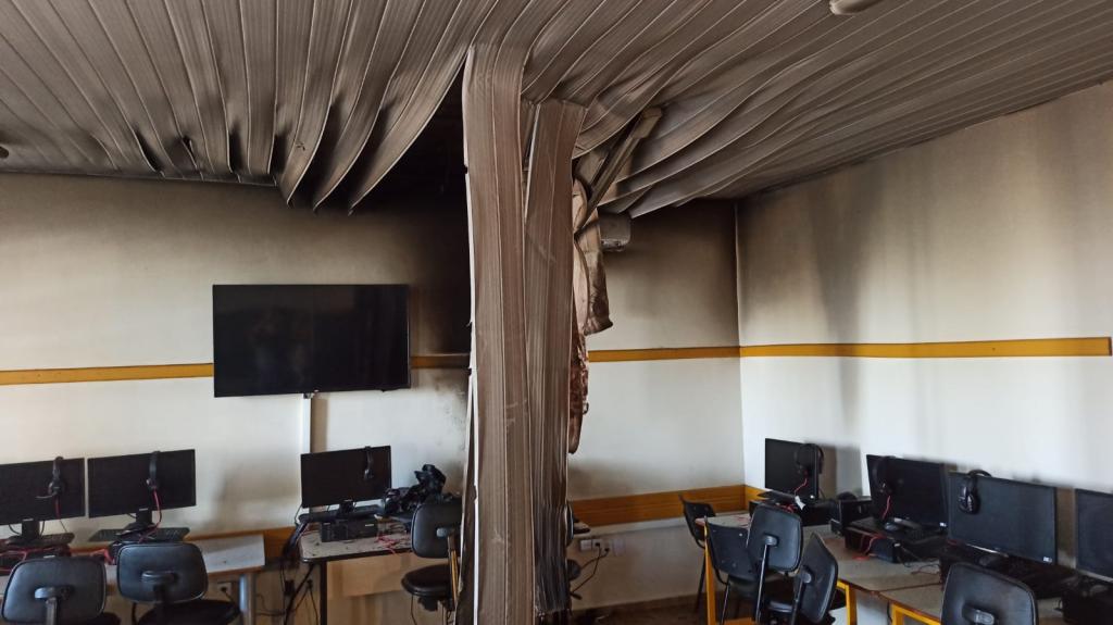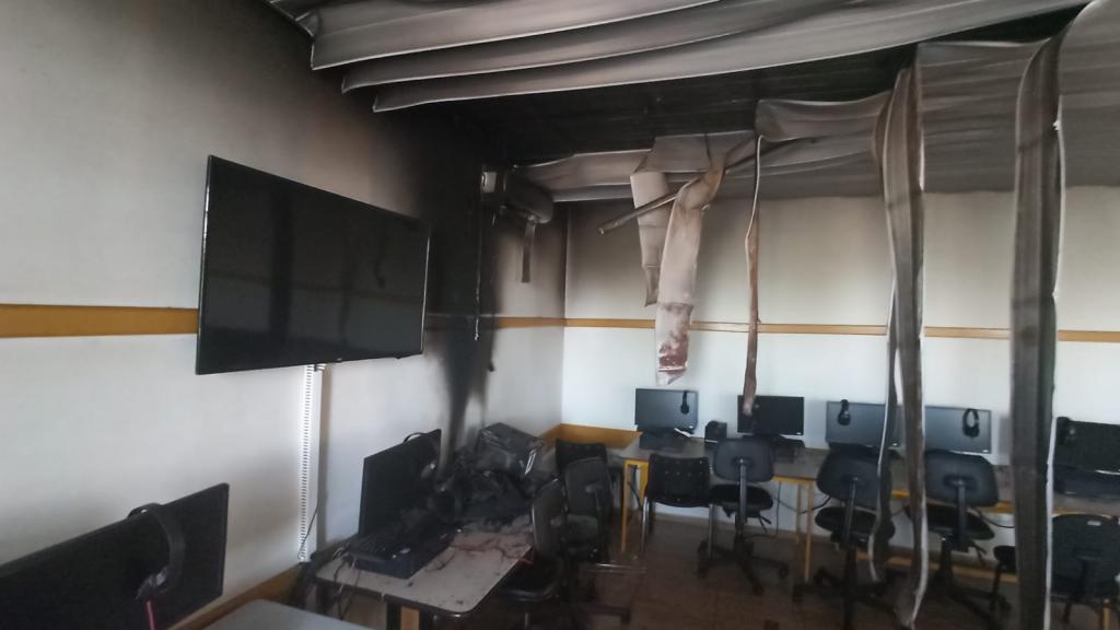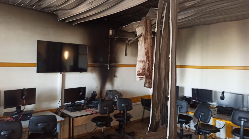 O incêndio começou quando a professora que dá aula de informática entrou na sala e ligou o ar condicionado e em seguida um curto circuito iniciou as chamas que queimou parte do forro de PVC, um computador e parcialmente uma TV de 42 polegadas.