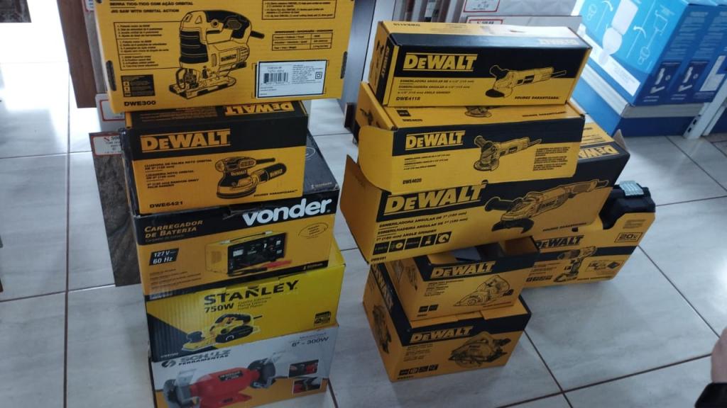 Do interior da loja foram levados diversos equipamentos, entre eles esmeril, plaina elétrica, carregador de bateria, lixadeira, serra tico-tico, serra circular, serra mármore, esmerilhadeiras e ainda uma parafusadeira.