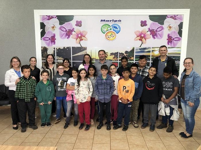 NA PREFEITURA – Nesta quarta-feira (14), o prefeito Rodrigo Schanoski e a vice-prefeita Janaína Müller Geraldi receberam as turmas do 4º e 5º ano da escola Eça de Queiroz, no Paço Municipal. O objetivo foi conhecer, na prática, o trabalho do Poder Executivo, assunto que está relacionado ao conteúdo trabalhado em sala de aula sobre o Município. Na oportunidade, o prefeito e a vice-prefeita parabenizaram Nayara pela conquista e pela representação de Maripá em nível nacional.
