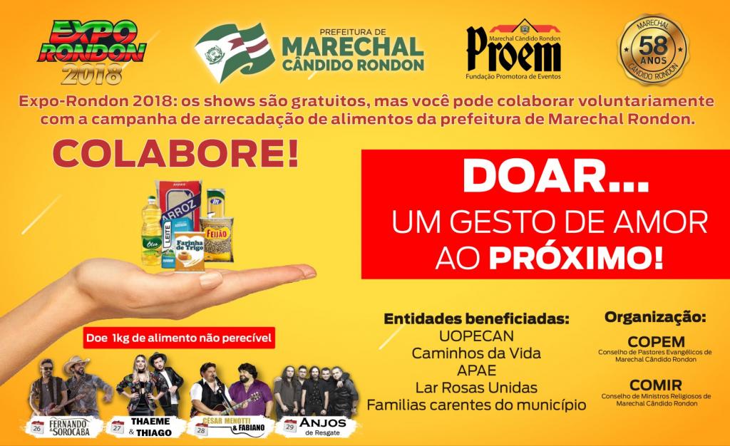 Neste ano, o evento que comemora os 58 anos do município rondonense contará com quatro grandes shows nacionais, que terão entrada gratuita e a possibilidade de doação de um quilo de alimento não perecível. A arrecadação será realizada logo após a entrada no show. Através desta doação voluntária, a administração municipal disponibilizará os alimentos para entidades filantrópicas.