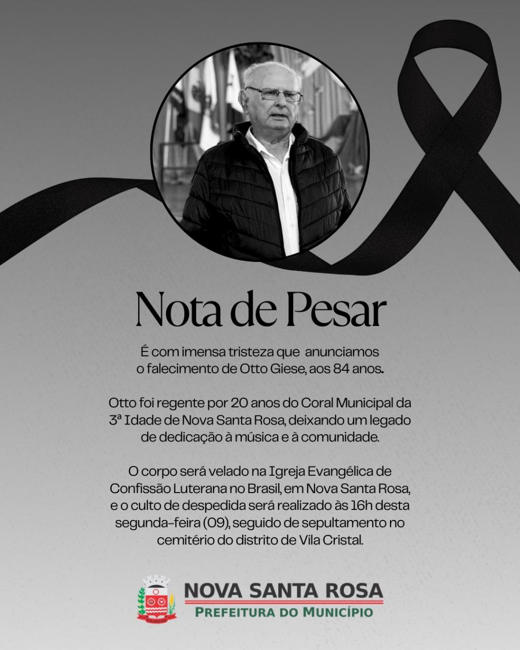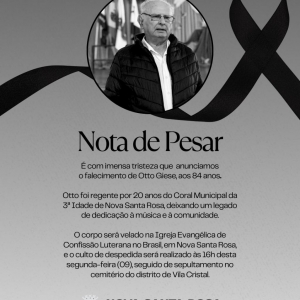Faleceu na manhã desta segunda-feira (09), aos 84 anos, Otto Giese, fundador do Coral Municipal da 3ª Idade de Nova Santa Rosa e regente do grupo por 20 anos. Sua trajetória foi marcada pelo amor à música e pelo compromisso com a valorização da cultura e da convivência comunitária.