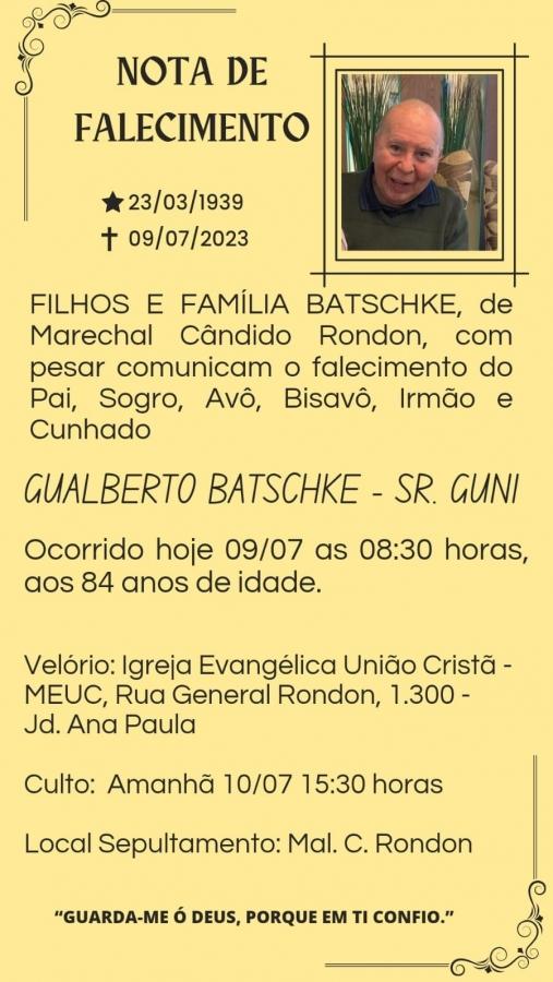 Faleceu nesta manhã na cidade de Toledo, onde estava internado, o empresário rondonense Gualberto (Guni) Batschke, 84 anos, em consequência de uma queda sofrida que resultou em traumatismo craniano.
