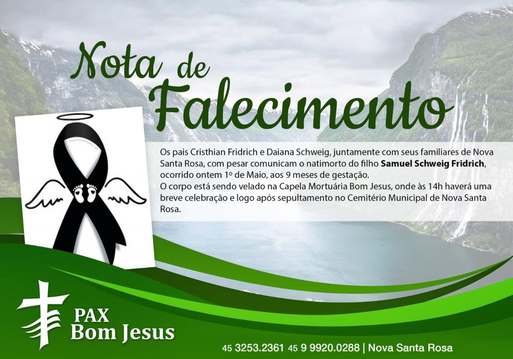 Os pais Cristhian Fridrich e Daiana Schweig, juntamente com seus familiares de Nova Santa Rosa, com pesar comunicam o natimorto do filho Samuel Schweig Fridrich, ocorrido ontem 1º de Maio, aos 9 meses de gestação.