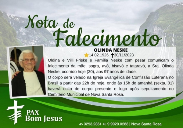 Oldina e Villi Friske e Família Neske com pesar comunicam o falecimento da mãe, sogra, avó, bisavó e tataravó, a Sra. Olinda Neske, ocorrido hoje (30), aos 97 anos de idade.