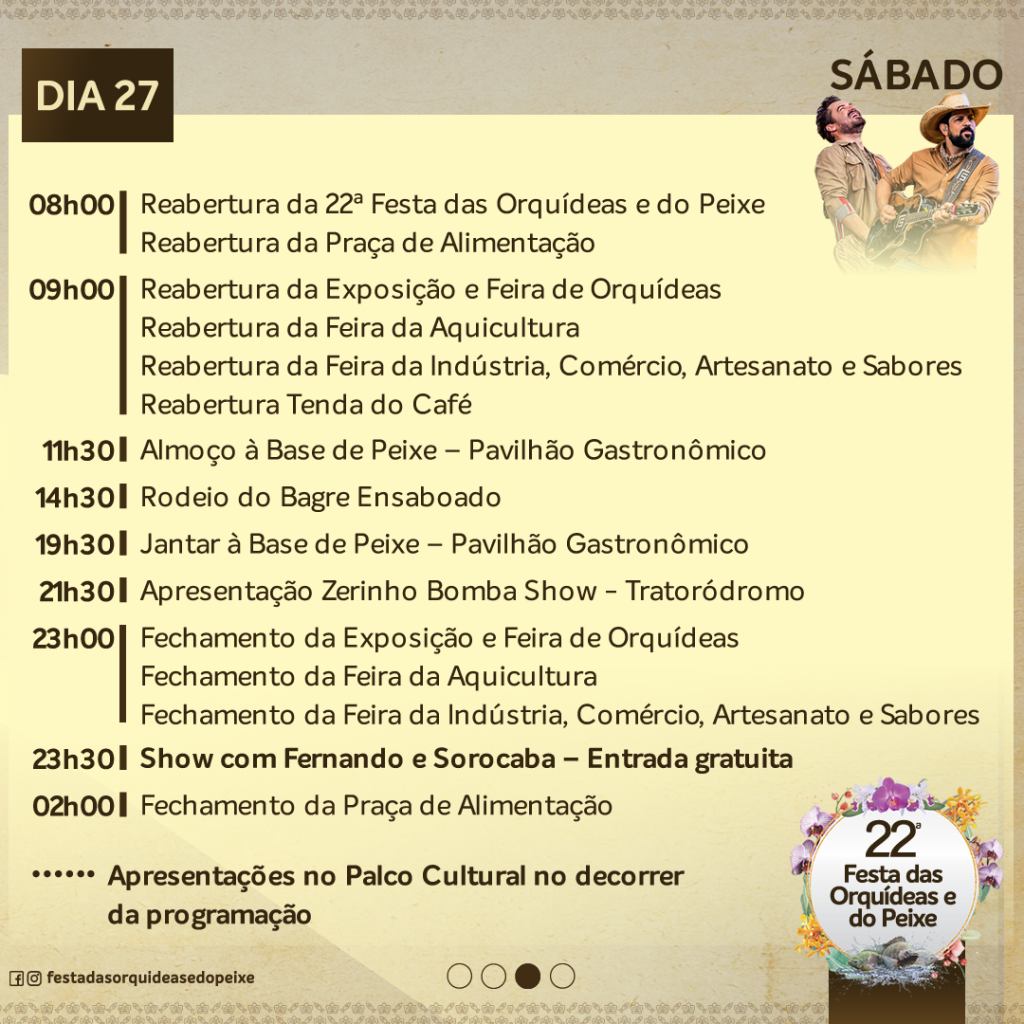 PROGRAMAÇÃO – Nos quatro dias de festa, o público pode visitar a Exposição e Feira de Orquídeas, a Feira da Aquicultura, a Feira da Indústria, Comércio, Artesanato e Sabores, a Tenda do Café, a Praça de Alimentação e atrações no Palco Cultural.